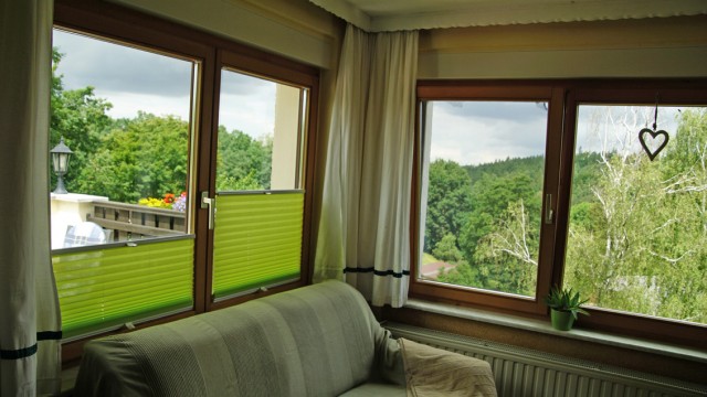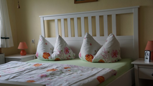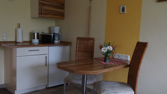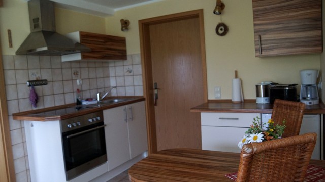 Die Ferienwohnung ist ausgestattet mit Einbauküchenzeile, separatem Essplatz und bequemer Sitzecke, einem Schlafzimmer mit Doppelbett und Platz für ein Kinderbettchen, sowie Bad mit Dusche und WC. Als Aufbettung ist das Sofa im Wohnzimmer ausziehbar.